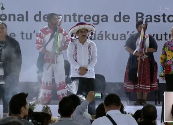 Los ministros y ministras electos de la Suprema Corte de Justicia de la Nación (SCJN) recibieron el bastón de mando de los pueblos…